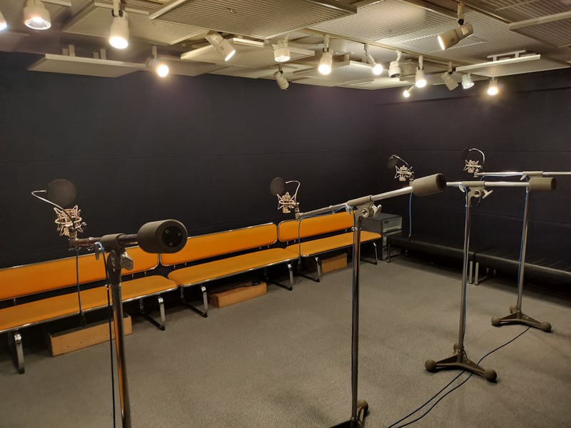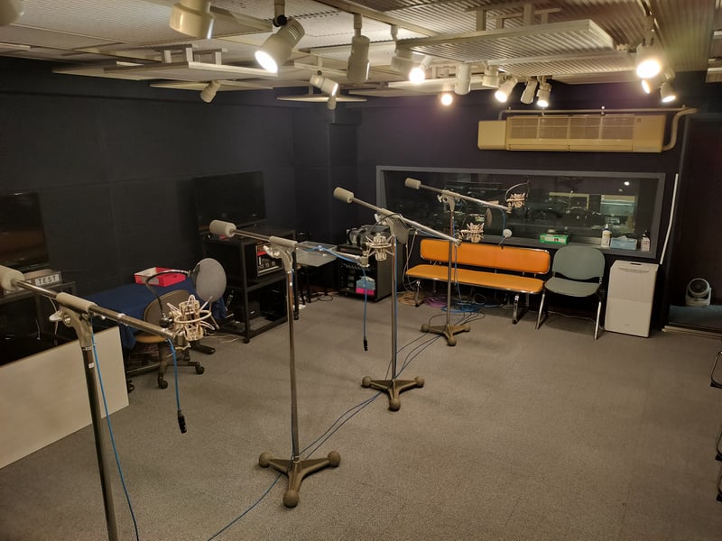 4本マイク、最大25名が入れる、大型収録スタジオ。